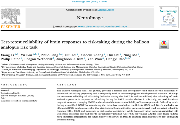 In January 2020, Key Laboratory of Applied Brain and Cognitive Sciences, School of Business and Management (SBM), Shanghai International Studies University (SISU), published an academic paper in the CAS Q1 journal NeuroImage, titled Test-retest reliability of brain responses to risk-taking during the balloon analogue risk task. Prof. Yu Pan is the co-first author and Prof. Hengyi Rao is the corresponding author of this paper. https://doi.org/10.1016/j.neuroimage.2019.116495