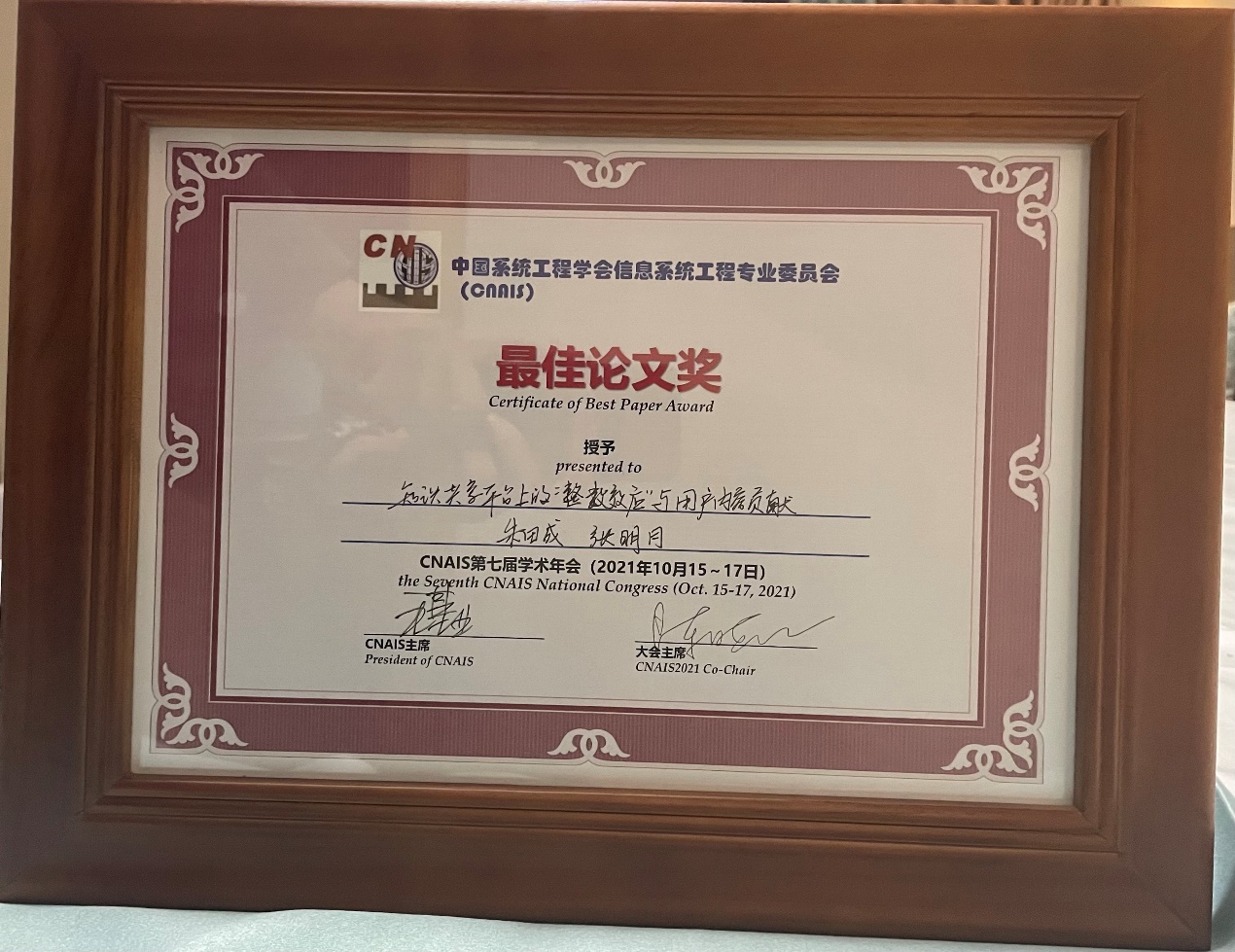 On October 17, 2021, Zhu Tiancheng, a master's student in the School of Business Administration, under the guidance of his supervisor, Associate Professor Zhang Mingyue (PhD supervisor in Information Management and Digital Marketing), was awarded the only best paper award at CNAIS 2021 for his paper "The Integer Effect and User Content Contribution on Knowledge Sharing Platform". The conference was attended by more than 800 registrants and received 76 oral presentations and 63 poster papers. This paper is the only best paper of the conference (with two other best paper nominations).
