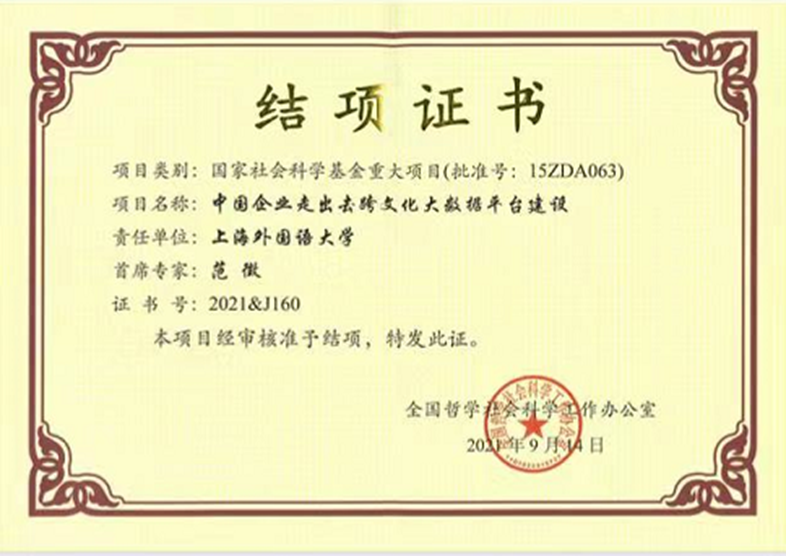 The National Social Science Fund of China (NSSFC) Major Project "Cross-cultural Data Platform for Chinese Enterprises Going Global" (15ZDA063), led by Professor Fan Zheng of School of Business and Management as the chief expert, has successfully completed its research tasks and passed the examination and acceptance of the National Office of Philosophy and Social Science. The project was established on July 29, 2015 and closed on September 14, 2021. It is the first major national project in the history of management discipline of our university.