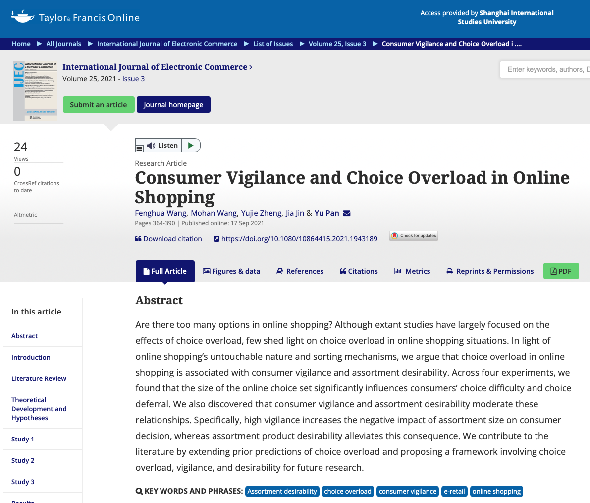 Fenghua Wang, Mohan Wang, Yujie Zheng, Jia Jin, and Yu Pan. Consumer Vigilance and Choice Overload in Online Shopping. International Journal of Electronic Commerce, 2021,25(3), 364-390. doi:10.1080/10864415.2021.1943189.