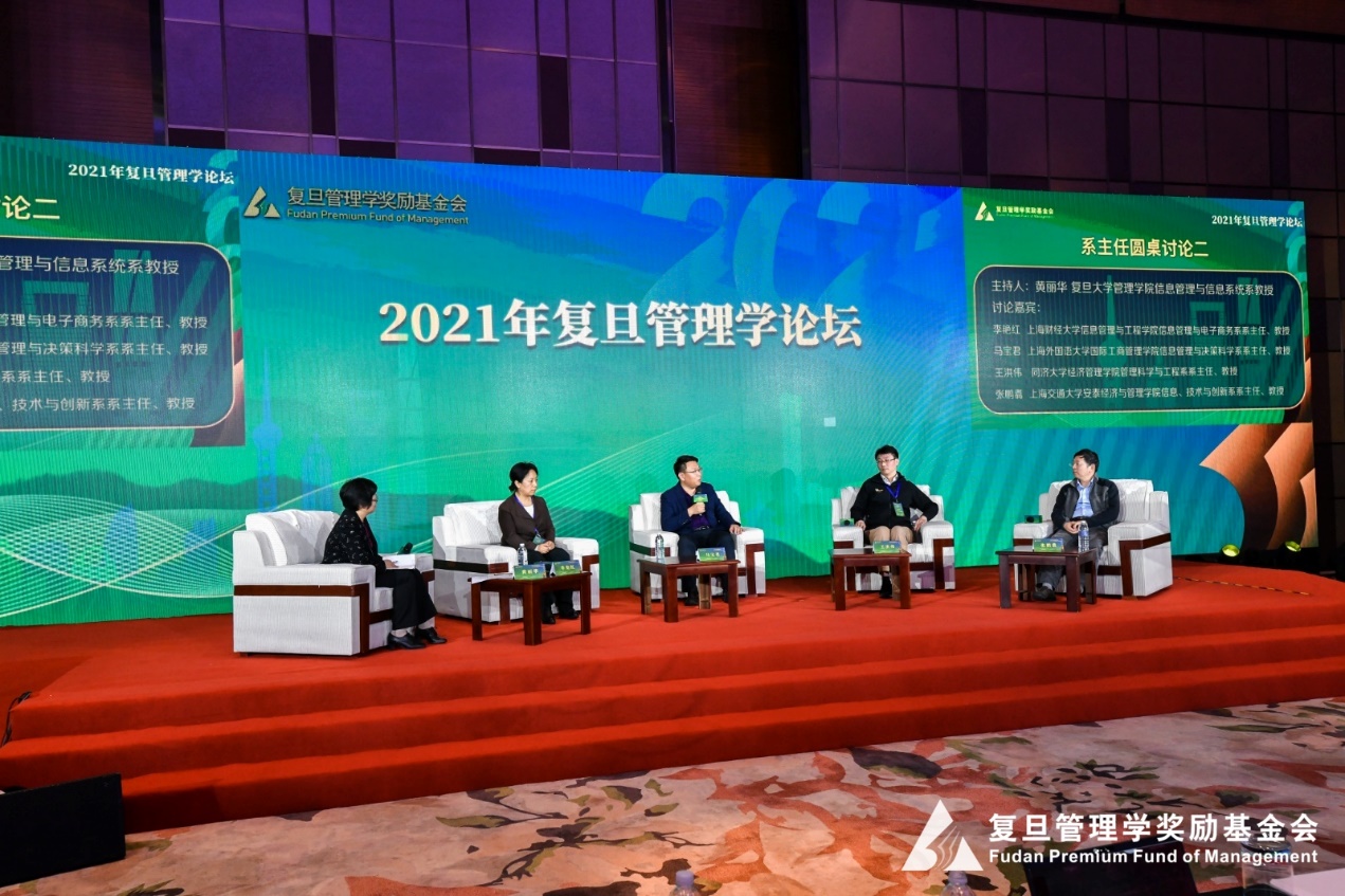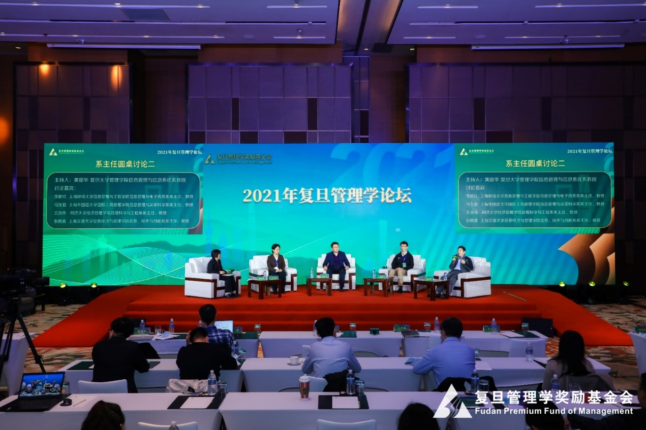 Prof. Ma Baojun, as the head of the Department of Information Management and Decision Science, was invited to participate in the second roundtable of the Forum with Prof. Huang Lihua of the Department of Information Management and Information Systems, School of Management, Fudan University. Professor Li Yanhong, Head of Department of Information Management and E-Commerce, School of Information Management and Engineering, Shanghai University of Finance and Economics, Professor Wang Hongwei, Head of Department of Management Science and Engineering, School of Economics and Management, Tongji University, and Professor Zhang Peng Shuang, Head of Department of Information, Technology and Innovation, Antai College of Economics and Management, Shanghai Jiao Tong University, discussed the challenges faced by information management and information systems, and shared effective measures and opportunities. It was agreed that the intelligent era requires business schools to produce talents who are well versed in both information technology applications and management methods. To achieve this goal, we need to make more efforts in academic training and faculty building. From the perspective of academic training, we should go beyond the limitations of a single major and strengthen the cross-fertilization of multiple disciplines; while in the construction of the faculty, we should let the teachers, especially the young teachers, give full play to their strengths in technological innovation, so as to promote the growth of teachers to a virtuous cycle of "consciousness, automaticity and autonomy".