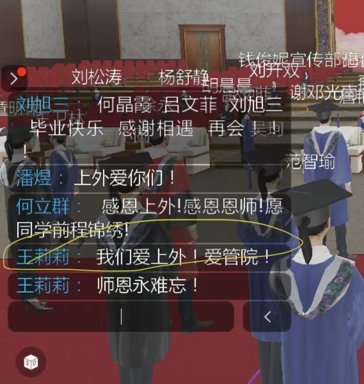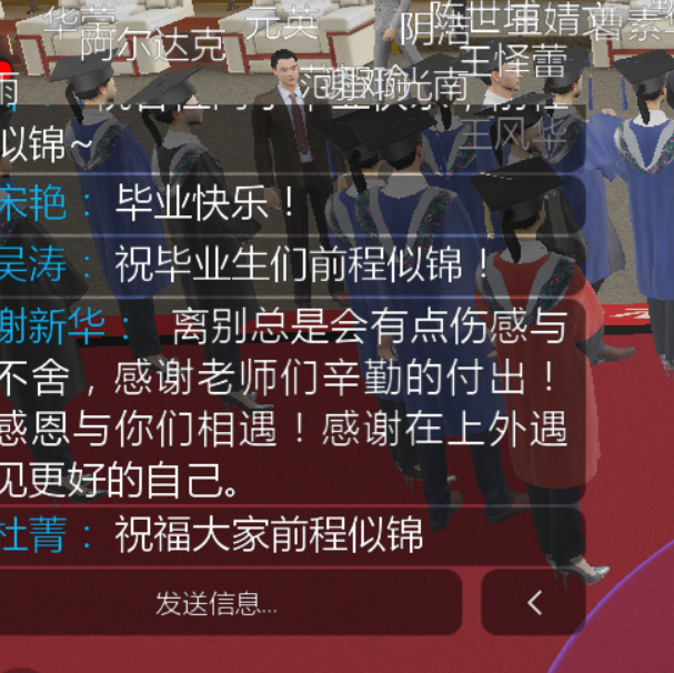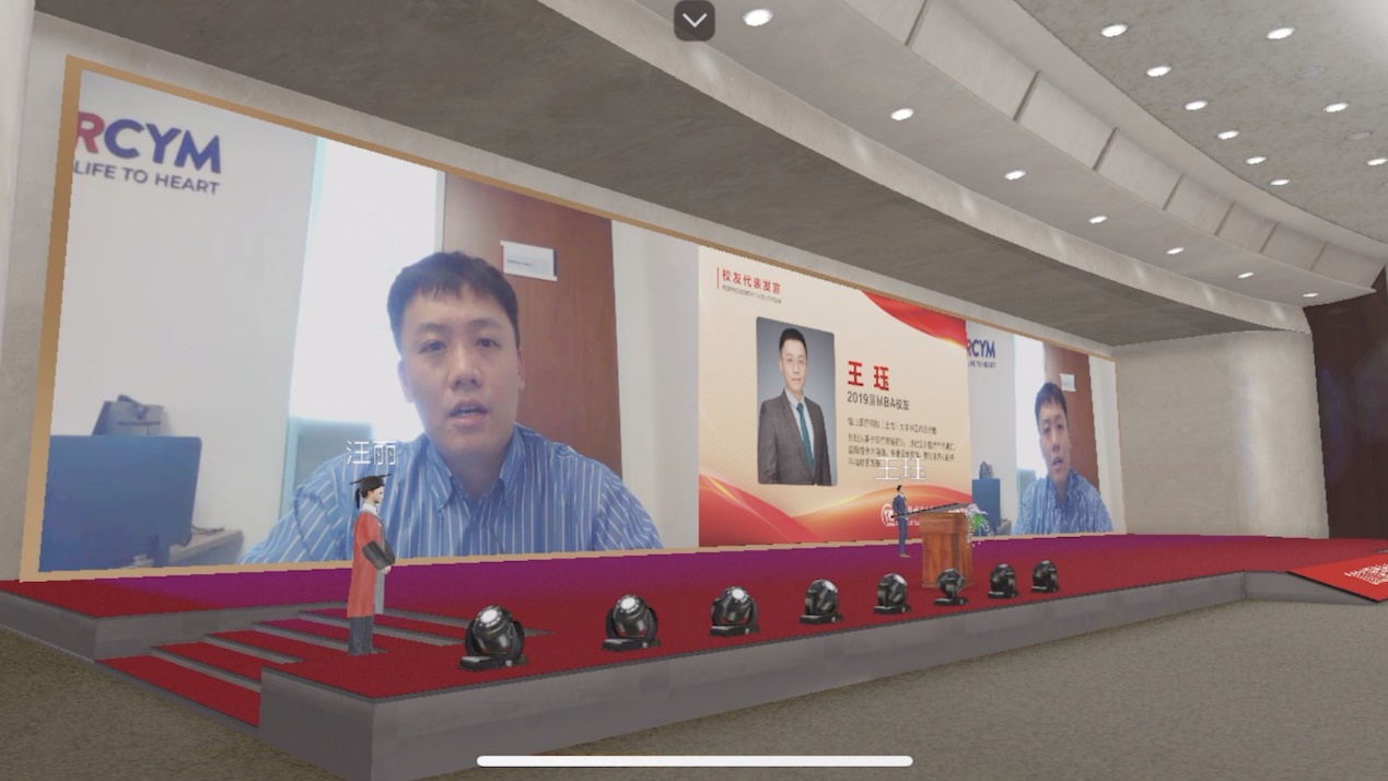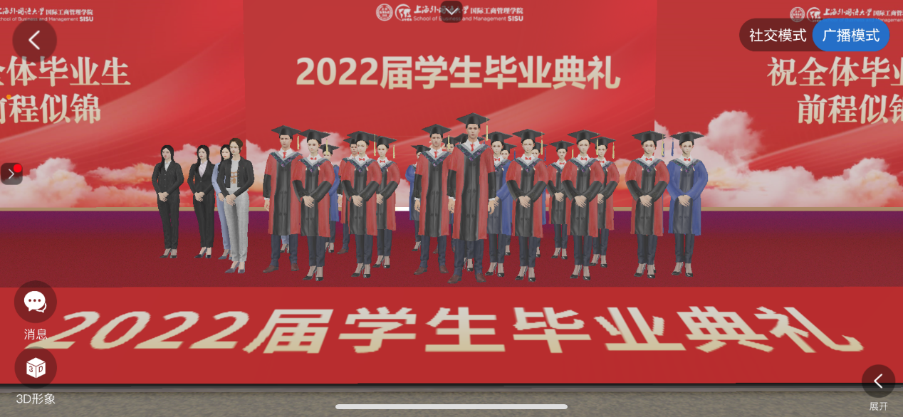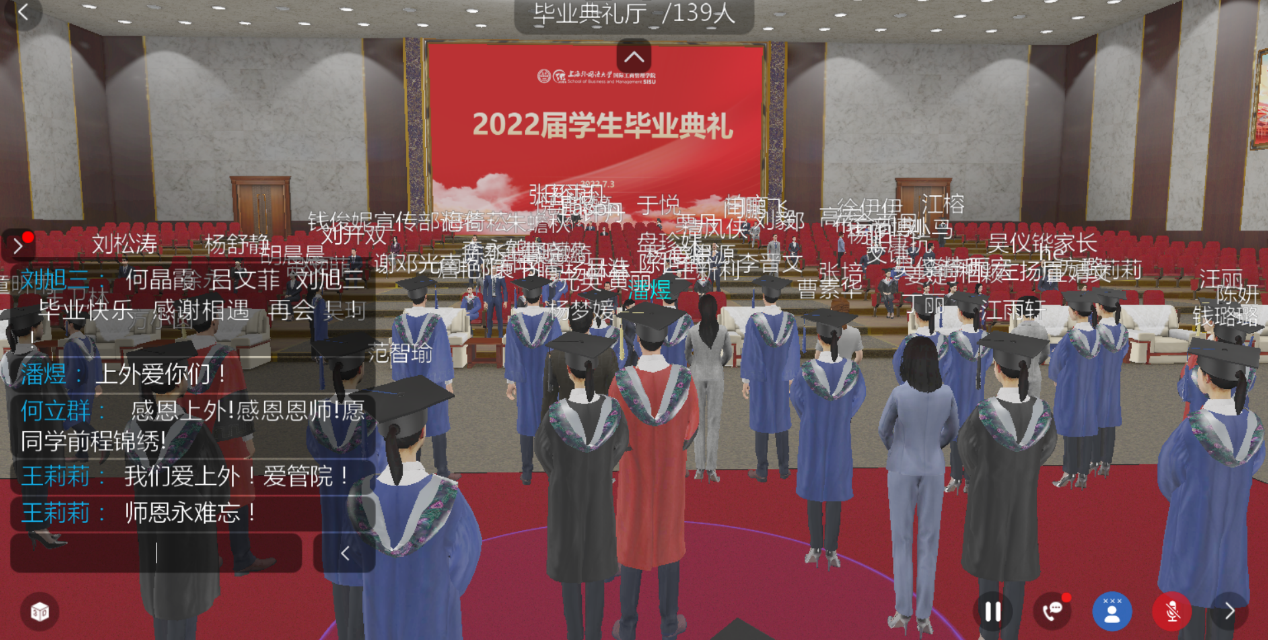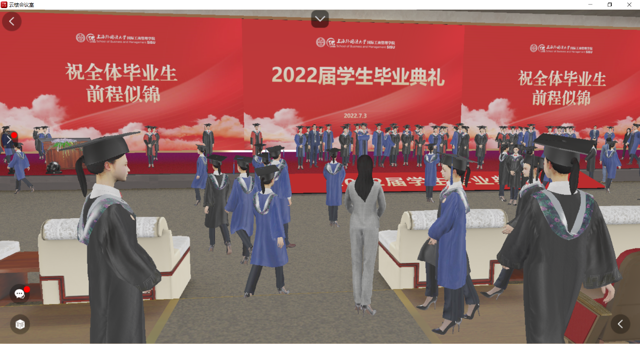 One of the highlights of this graduation ceremony is to restore the offline graduation ceremony in a relatively real digital simulation venue. After registering in the cloud building conference system, the SBM faculties, students and visiting relatives and friends can let their "digital avatars" participate in the ceremony in the simulation venue from a real perspective, and experience the graduation ceremony process and venue interaction in the whole process, especially immersive experiences such as certificate awarding, tassel turning, photo taking, etc., leaving no regrets in the memory of youth. Lu Jiaqi, an outstanding graduate of Shanghai, told the reporter that when her "digital avatar" participated in such interactive links as message, applause and praise, the sense of substitution that resonated with more than 300 people on the same frequency and the experience that complements reality and falsehood made her unforgettable all her life. Wang Lili, the representative of MBA graduates, left a message on the ceremony line saying, "We love SISU! We love the SBM!", Joy and gratitude are expressed in words. After the ceremony, the SBM dean Pan Yu led the faculties attending the ceremony to the front desk to take a group photo with the graduates.