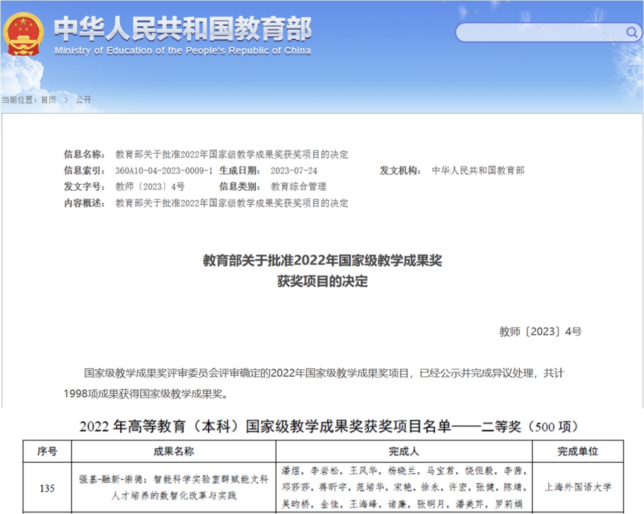 On July 24, the Ministry of Education issued the Decision of the Ministry of Education on Approving the Award Project of the National Teaching Achievement Award in 2022 (Teacher [2023] No. 4). SBM of SISU's Strengthening Foundations – Integrating New Knowledge- Advocating Morality: The Digital and Intelligent Reform and Practice of Empowering the Cultivation of Liberal Arts Talents in the Intelligent Science Laboratory Group won the second prize of the national teaching achievement of higher education (undergraduate). This is the first time that SBM has taken the lead in winning the National Teaching Achievement Award, achieving a historic breakthrough in SBM's National Teaching Achievement Award.