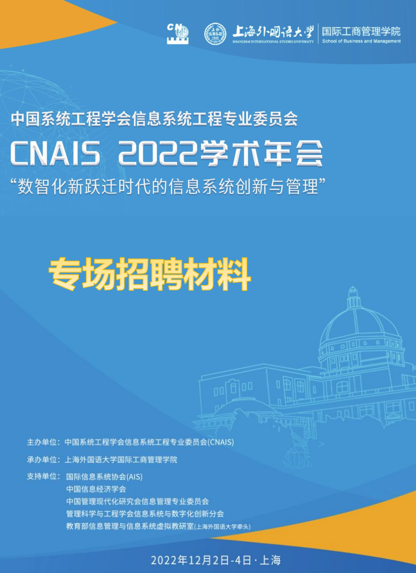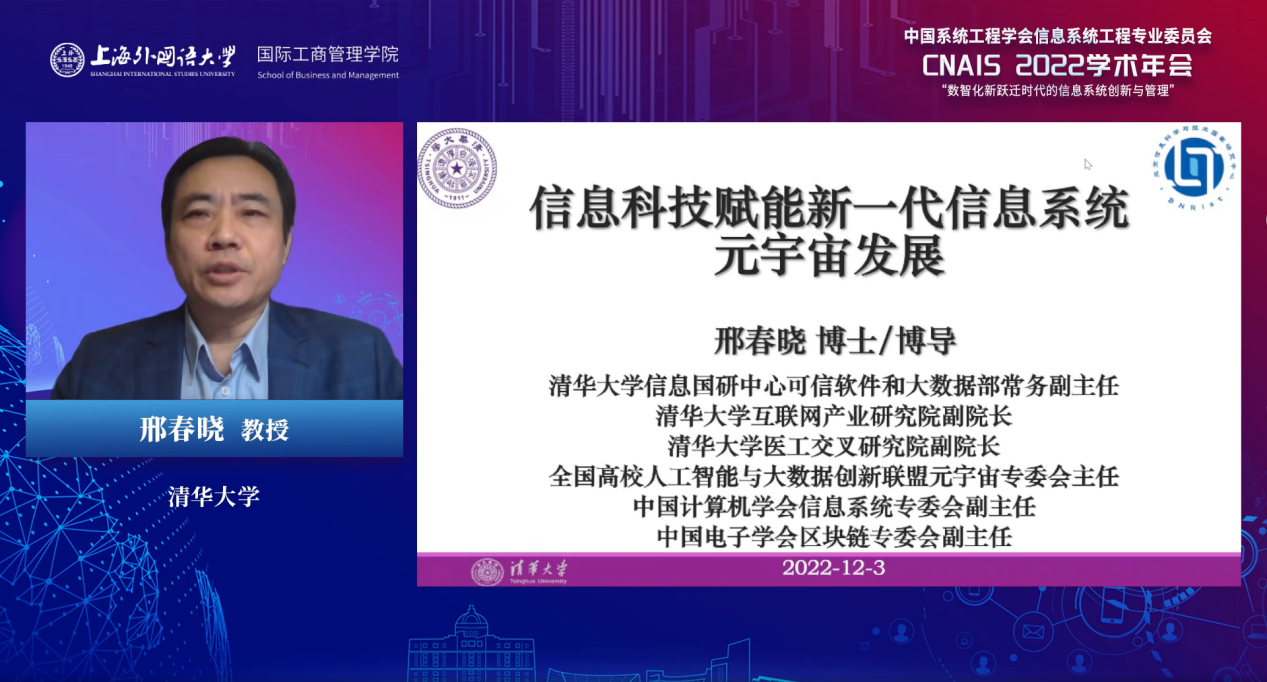 Against the backdrop of revolutionary applications of big data and artificial intelligence technology, as well as significant advancements in intelligent algorithms, and driven by strategic measures such as the National 14th Five Year Plan and 2035 Vision Outline, the digital economy, data elements, and governance, China's information systems industry is facing a series of new development opportunities and profound challenges, Related research and practice are fully entering a new leap from "digitization" to "digital intelligence". In this context, from December 2nd to 4th, 2022, the CNAIS 2022 Information System Engineering Professional Committee of the Chinese Society of Systems Engineering, with the theme of "Innovation and Management of Information Systems in the New Leap Era of Digital Intelligence", hosted by SBM, was grandly held online.
