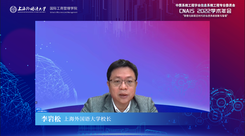 President Li Yansong of SBM, Dean Pan Yu of SBM, Chairman Yang Xiaoguang of the Chinese Society of Systems Engineering, Vice Chairman Feng Juan of the International Information Systems Association (AIS), and Professor Xu Xin, Chairman of the CNAIS 2022 Conference, delivered speeches respectively. The speech session was presided over by Professor Ma Baojun, Chairman of the Conference Procedure Committee and Professor of SISU.