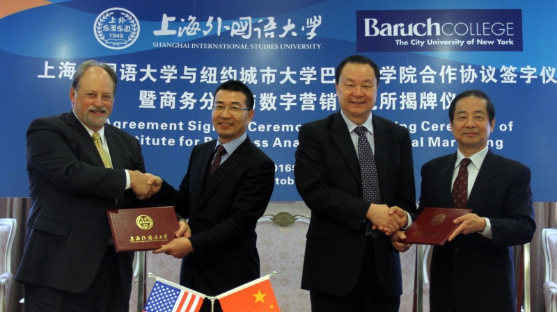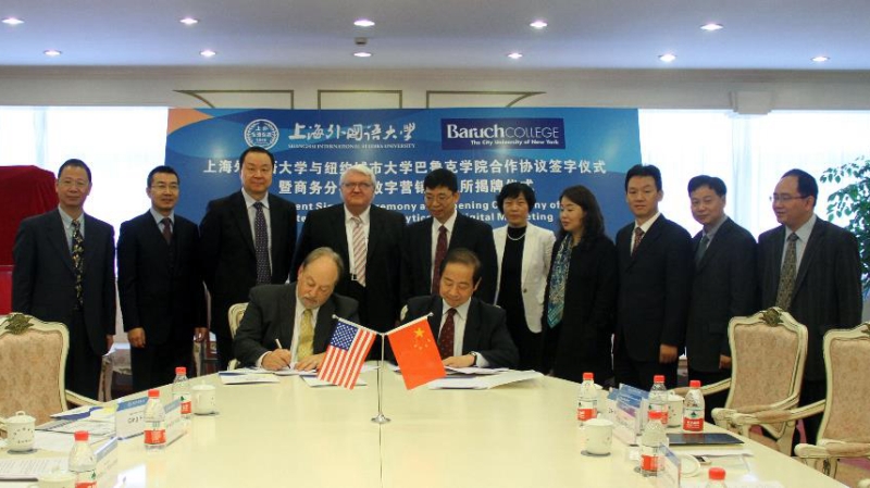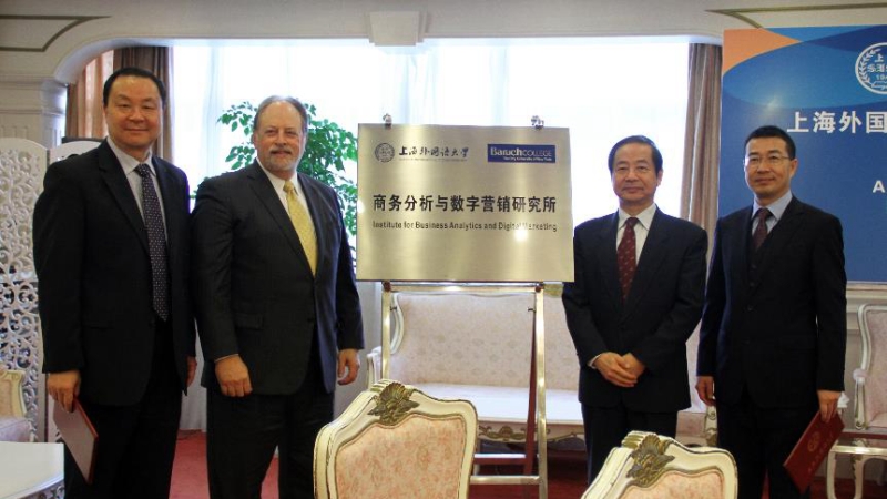 After themeeting, President Cao and President Wallerstein signed the Agreement onMSC Program on Digital Marketing between Zicklin School of Business, Baruch College, the City University of New York and School of Business and Management, Shanghai International Studies University. Letters of Appointment were issued to Prof. Wang Weijun at School of Business and Management, SISU and Prof. Hu Qing of Zicklin School of Business, the two of whom co-chair as the institute director. The presidents also hosted the opening ceremony of the Institute for Business Analytics and Digital Market. Also present at the Signing and Opening ceremony are Ms Zhang Hongling, head of the Office of International Cooperation and Exchange, also the host of the meeting, Ms Zhang Xuemei, head of the Office of Confucius Institute, Mr. Wang Youyong, head of the Office of Research Affairs, Associate /Prof. Xu Yong, SBM Party Branch Secretary, Executive Dean Prof. Pan Cong, Prof. Wang Weijun at the Department of Information Management, and A/Prof. Chen Xinli, director of the Office of International Program Development and Certification.