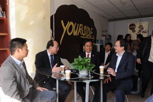 Wu Hongbo looked at a teaching demonstration in the ERP (Enterprise Resource Planning) Lab, and inspected documents displayed in SBM’s exhibition room. He listened attentively as Dean Fan Zheng gave an introduction on the history of SBM, discipline development, admissions, talent cultivation and achievements. Wu particularly sang high praise to the establishment of the Public Relations program in SBM. In Yourside Coffee, a coffee bar set up by SBM students, Wu was very interested in students’ initiative to start their own business, and asked many questions about Programs of Innovation Training and Entrepreneurship for Undergraduates SBM.
